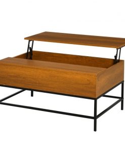 This Traditional Farmhouse Brown Lift Top Coffee Table w/ Hidden Storage Black Metal Legs can be lifted up and forward, creating a perfect surface for working or dining. A high-quality gas lift device allows the coffee table to be raised and lowered safely and quietly. Under the tabletop of this modern coffee table is a large compartment designed to store different items such as magazines, laptops, remote controls, and game controllers. Made of high-quality P2 grade MDF board and industrial-style metal legs.