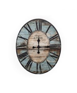 The Turquoise Oversized Distressed Paris Wood Wall Clock is oval shaped and full of old world charm. Why settle for a simple wall clock to merely ensure the time. Bring both function and Paris flair to your space with this wall clock. It showcases a typographic motif in the center. This wooden wall clock is large enough to become an eye catching focal point in any room. The classy style of this clock is the epitome of elegance from the simple colors to the Roman numerals surrounding its edge. This oval wooden clock will keep track of your time and add farmhouse appeal to your wall decor.