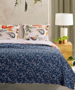 Bring the animals of the forest into your bedroom with this 2 Piece Farmhouse Blues Friendly Animals Cotton Reversible Quilt Set, Twin. Friendly foxes, owls, hedgehogs, and birds will scurry over your mattress as fall colors bring a bright feel to your room. This cotton and polyester set reverses to a navy blue background with white budding willow branches scattered across in a full pattern. 1 matching pillow sham included. The machine-washable quilt features fabric bound edges, and it is oversized for better coverage on your mattress.
