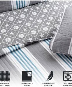 You can’t go wrong with this Twin Size Coastal Grey/Blue Nautical 2 Piece Cotton Quilt Set. Looking for a simple and tasteful coastal quilt for your beach-themed bedroom? The primary side of the quilt features simple blue and grey striping, while the reverse features a pattern design accompanied by starfish, sand dollars, and fish. The blue color ties in the coastal feel, while the grey neutralizes the quilt. Enjoy this super comfortable quilt in any bedroom.