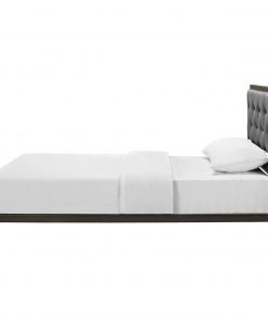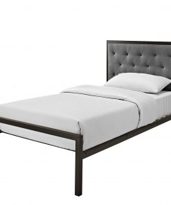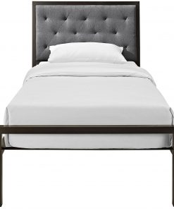 • Twin size Metal Platform Bed with Gray Fabric Button Tufted Upholstered Headboard