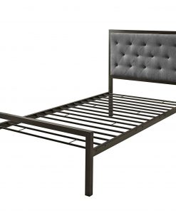 Sleep peacefully with this Twin size Metal Platform Bed with Gray Fabric Button Tufted Upholstered Headboard solid in both style and construction. The bed comes with a powder-coated steel frame that offers sturdy and long-lasting support; while the fabric headboard with deep tufted buttons add a touch of magnificence to an otherwise minimalist design. The Platform Bed comes with foot glides to prevent floor scratching and does not require a box spring. Mattress not included.