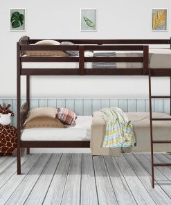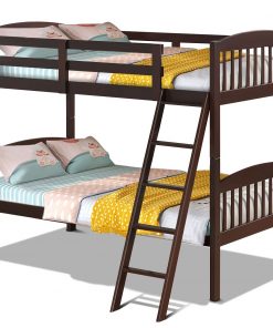 Twin over Twin Wooden Bunk Bed with Ladder in Dark Brown Finish