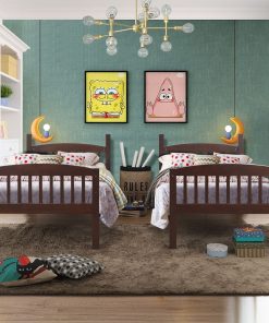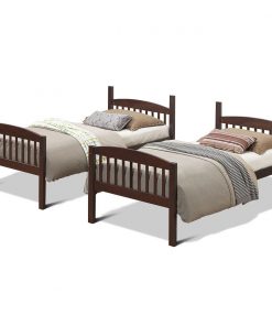 This Twin over Twin Wooden Bunk Bed with Ladder in Dark Brown Finish is equipped with guard bar and wide inclined ladder, your children will climb up or down easily and you don’t need to worry about whether children fall down from the bunk bed. And your children can also have a comfortable sleep. The hollowed-out design of head board and foot board design adds beauty to the whole appearance of the bunk bed. For practical reasons, the bunk bed can be separated into two independent beds. When your children grow up, they can sleep in their own bed in different room to protect their privacy. And under the bed, there is enough room for you to store sundries to keep home clean and tidy. If you are looking for a such product, don’t hesitate to buy it!