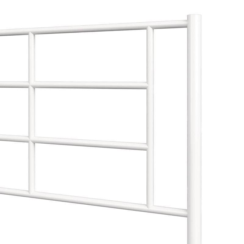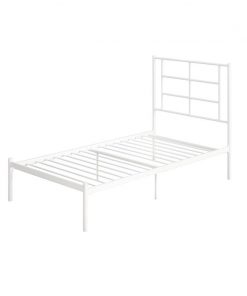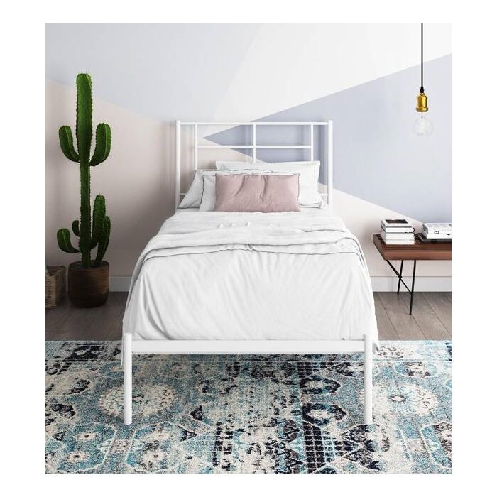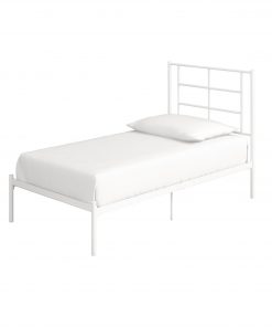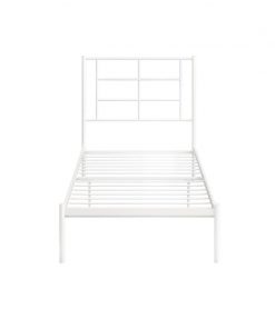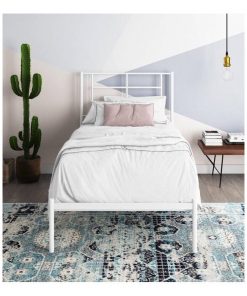 The Twin Size Modern White Metal Platform Bed with Geometric Headboard is the perfect combination of functional design and amazing style. This bed designed with a simple geometric headboard that makes a statement. The metal construction includes side rails, additional center legs, and secured slats. The bed has your back thanks to its 11-inch under-bed clearance that allows you to store those clothes and shoes that can’t seem to fit anywhere else.