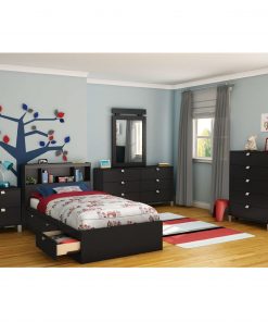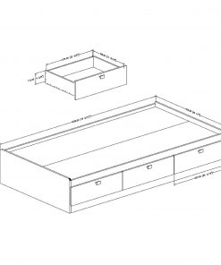 Fashionably functional Twin size Platform Bed with 3 Storage Drawers in Black Finish. The 3 under-bed storage drawers provide plenty of space for clothes, blankets and toys. Flat-fitting satin nickel finish metal handles on bed for added protection. The bed is reversible, therefore drawers can be put on either side of the bed. It fits twin size mattress and box spring is not required. Interior drawer dimensions: 22-1/2-inch wide by 17-1/4-inch front to back. Its weight capacity is 250-pound. Also available in Chocolate or Pure White finishes. It is made of recycled CARB compliant particle panels. The glides are made of polymer and include dampers and catches. Measures 76-1/4-inch wide by 40-1/4-inch deep by 13-3/4-inch high. It is delivered in one box measuring 86-1/2-inch by 22-inch by 5-1/4-inch and weights 110-pound.