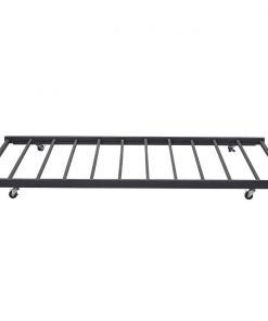 Twin size roll-out metal trundle bed frame with 4-wheels. Featuring tubular metal construction that can hold up to 300 pounds, this trundle bed has four roller wheels to easily slide under a daybed, and metal slats that eliminate the need for a box spring.