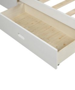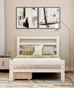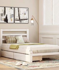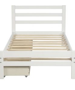 Get organized with the Twin size White Low Profile 2 Drawer Storage Platform Bed, The bed comes complete with two underside pull out drawers. Strong, solid wood make up the frame and legs to support your favorite memory foam, latex, or spring mattress (mattress not included), and the simple yet stylish panel design of the headboard and footboard add subtle refinement to any room decor. The modern clean, straight line silhouette makes it easy for this piece to fit into any room; drawers can fit on either side of the platform bed.