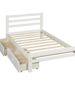 Get organized with the Twin size White Low Profile 2 Drawer Storage Platform Bed, The bed comes complete with two underside pull out drawers. Strong, solid wood make up the frame and legs to support your favorite memory foam, latex, or spring mattress (mattress not included), and the simple yet stylish panel design of the headboard and footboard add subtle refinement to any room decor. The modern clean, straight line silhouette makes it easy for this piece to fit into any room; drawers can fit on either side of the platform bed.