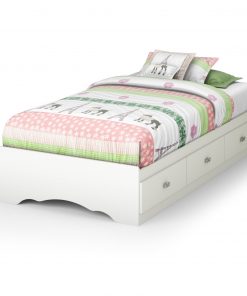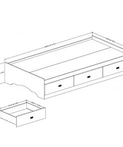 With its three drawers, this Twin size White Platform Bed Frame with 3 Storage Drawers is a great space-saving solution. Girls will love its jewel like chrome handles and decorative cut-outs. It can also be attached to the matching Twin 39-inch headboard for even more storage options (Headboard not included). It is equipped with polymer glides that include dampers and catches for enhanced safety. Its weight capacity is 250-pound and no box spring is required. Bed is reversible therefore drawers can be placed on either side of the bed. The interior drawer dimensions are 22-1/2-inch wide by 17-3/4-inch front to back. It measures 76-1/4-inch long by 40-1/4-inch wide by 14-1/2-inch high. It is delivered in a box measuring 85-inch by 23-1/2-inch by 4-1/2-inch and weighs 126-pound. Made of non-toxic recycled CARB2 compliant laminated particle panels. Complete assembly required by 2 adults. Tools are not included. 5-year limited warranty. Made in Canada.