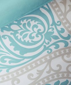 This Twin / Twin XL Comforter Set in Light Blue White Grey Damask Pattern is the perfect way to make a fashion statement in your bedroom. The vibrant aqua and grey damask print adds a pop of color to this comforter. Two embroidered decorative pillows are included in this comforter set for a finished look.