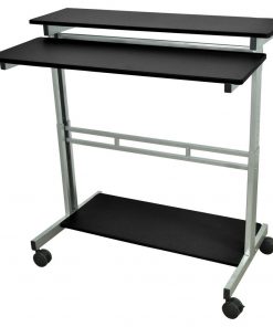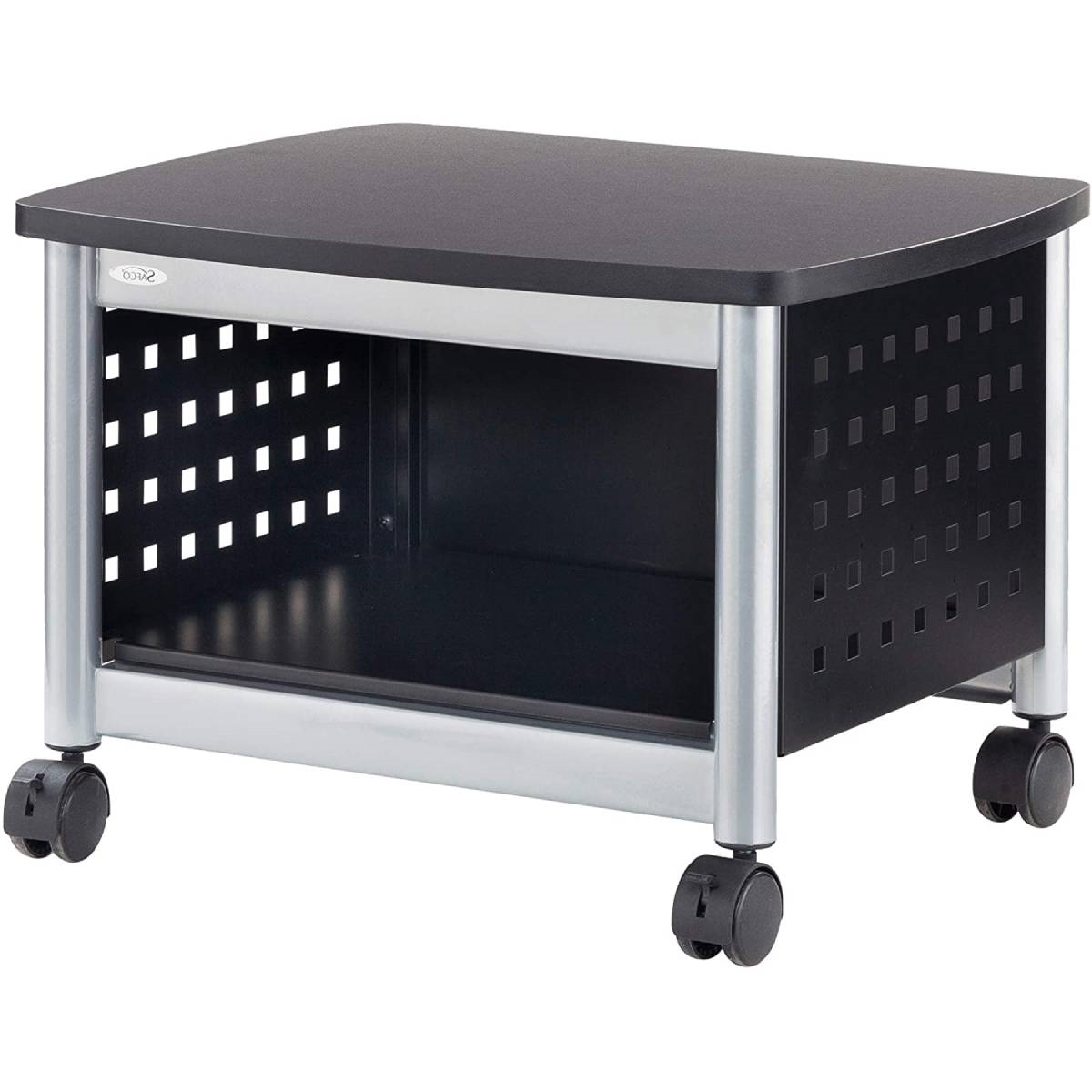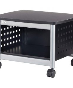 This Under-Desk Printer Stand Mobile Office Cart in Black and Silver is an easy way to free up desk space and keep additional printing supplies close at hand. Large enough to accommodate most desktop printers and other small office machines but is only 14-1/2″ high for compact storage. Attractive black stand with unique hole pattern design and silver leg accents. Mobile on four casters, two locking. The stand hides printers and small office machines under most work-surfaces.
