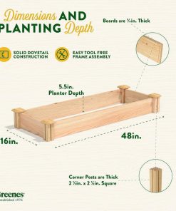 Grow all your favorite herbs, plants, and vegetables with this Unfinished Cedar Wood Raised Garden Bed Planter 4-ft x 16-inch – Made in USA. It assembles without tools using the time tested and proven Greens Fence Company dovetail design: simply slide the boards into the joints to form the frame, attach the caps, and then add soil, plants, and sunshine to start growing the garden of your dreams! Greenes Fence Premium line of cedar raised garden beds allows you to create an open-bottom frame to support your garden. Raised garden beds give your plants the room they need to grow in the location of your choice. Our cedar frame is left untreated, which means it is organic and safe to grow vegetables, herbs, and fruits in.