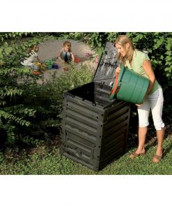 This UV-Resistant Black Recycled Plastic Compost Bin with Lid – 79 Gallon turns kitchen waste into rich compost. Constructed from 100-Percent recycled UV-resistant polypropylene. Great one piece feed opening. Lid with wind protection. Easy and convenient assembly without tools. Convenient withdrawal of compost thanks to a big flap with handle. Ideal ventilation. Requires little space. 25.6-inch long by 23.6-inch wide by 35-1/2-inch high. 79-pound. capacity.