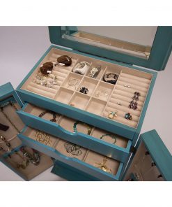 Divided and felt lined compartments, soft ring rolls and side doors for long necklaces