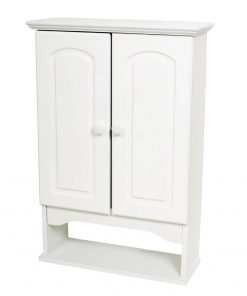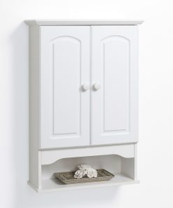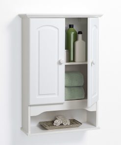 Hang this attractive wall cabinet anywhere you need additional storage. Great for bathrooms, laundry rooms and more! The White 2-Door Bathroom Wall Cabinet with Open Storage Shelf gives you convenient storage without using precious floor space. The arched door panels and crown molding top provide a clean, upgraded look to any room. Cleans easily by using a damp cloth. Step by step instructions allow for easy assembly.