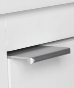 - Flat, silver handles add a modern impression to cabinet doors along with the clean, horizontal grooves