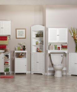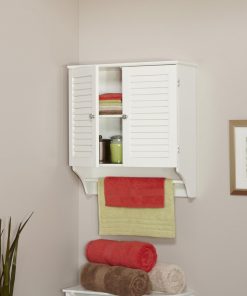 This White Bathroom Wall Cabinet with 2 Louver Shutter Doors and Shelf features a convenient two door shutter design in a wall cabinet. Includes a full towel bar and one shelf inside the cabinet.