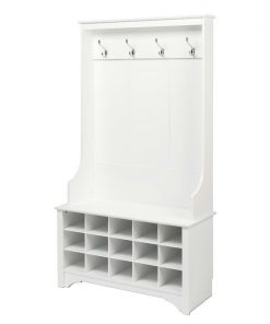A hall tree is an organization superhero. Often combining shoe storage with coat hooks, they’re the perfect item for an entryway where kicked-off shoes are running amok. This piece, constructed of manufactured wood, delivers on all the same storage promises. Featuring 15 shoe cubbies, 4 hooks, and a bench, it’s sure to help clear up hallway clutter. Constructed with contoured sides and decorative molding, it offers any room a touch of traditional or cottage-inspired charm. Measuring 68” H x 38” W x 15.5” D, it can easily work into rooms with other pieces or be a solo storage anchor.