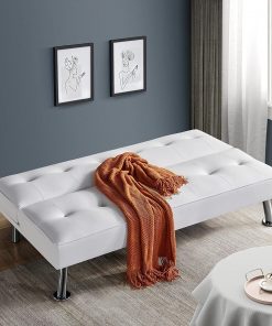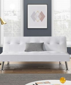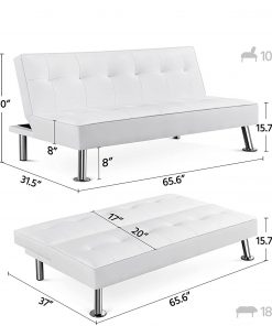 This White Faux Leather Click Clack Adjustable Futon Sleeper Sofa provides functional and aesthetic furniture for any limited space. Crafted from a plywood frame, faux leather covering, foam fill, and strong metal spring, this convertible sofa bed features a flexible folding contraption to lock the back at 2 tilt angles for reading and lounging or lay it down as a comfy platform bed. With the solid construction, it can easily hold up to 770lb. The tufted faux leather upholstery presents an understated yet luxurious touch.