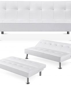 This White Faux Leather Click Clack Adjustable Futon Sleeper Sofa provides functional and aesthetic furniture for any limited space. Crafted from a plywood frame, faux leather covering, foam fill, and strong metal spring, this convertible sofa bed features a flexible folding contraption to lock the back at 2 tilt angles for reading and lounging or lay it down as a comfy platform bed. With the solid construction, it can easily hold up to 770lb. The tufted faux leather upholstery presents an understated yet luxurious touch.