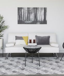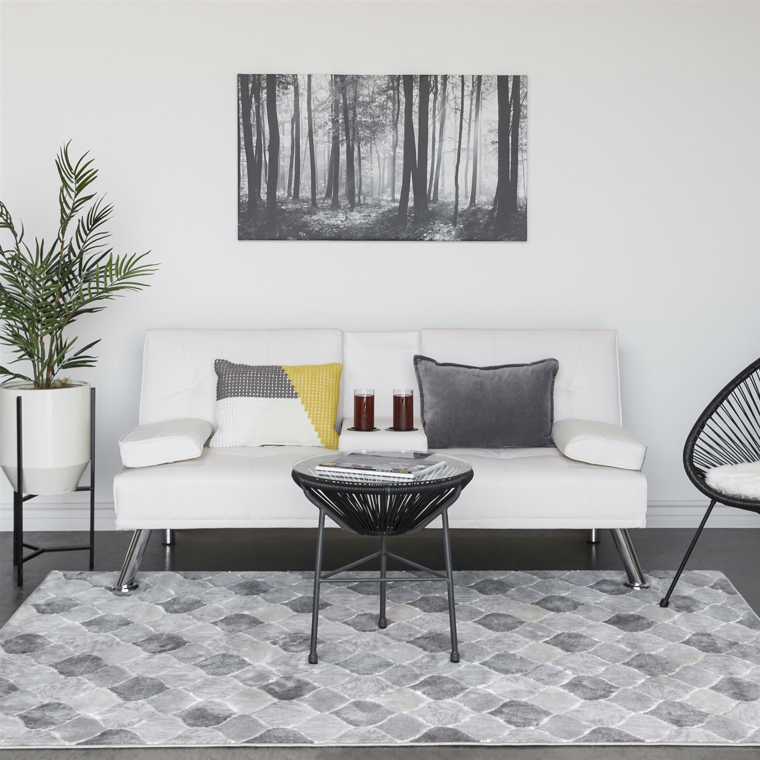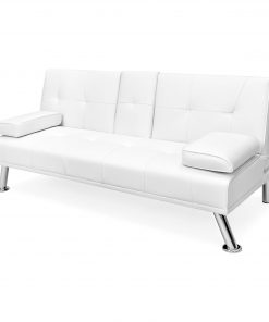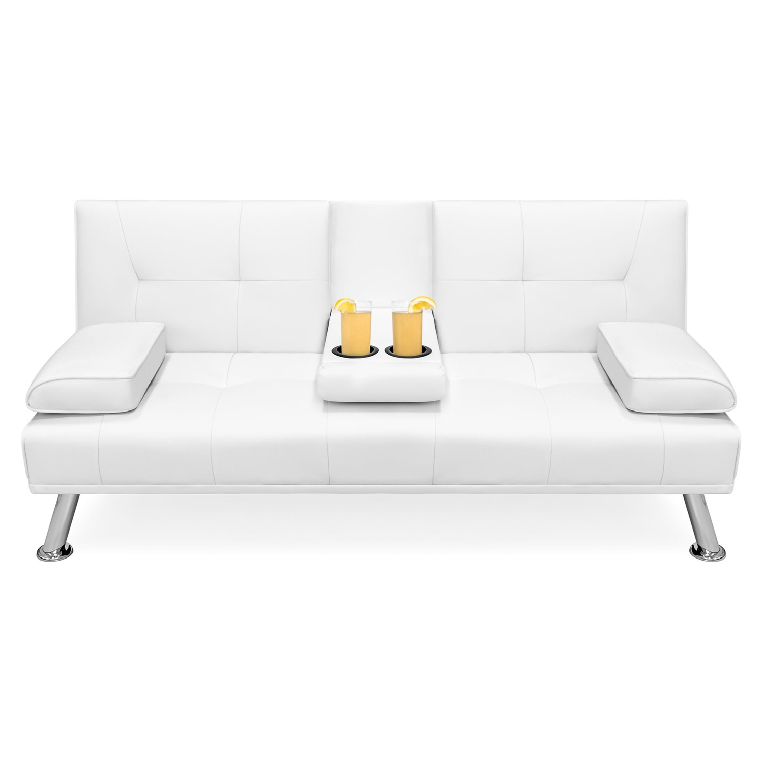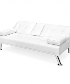 Enjoy the best in comfortable lounging with this White Faux Leather Convertible Sofa Futon with 2 Cup Holders. This convertible sofa futon is made with faux leather and 4 chrome metal legs to bring sleek style to any room. The sofa futon reclines easily and can be converted into a guest bed. Relax with family or friends and use the 2 cup holders enjoying your favorite drinks.