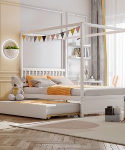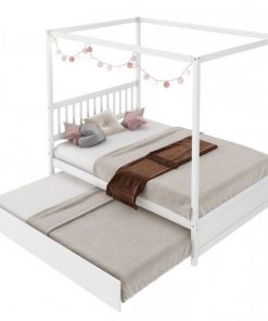 This White Full Size Canopy Platform Bed with Twin Roller Trundle Bed is a perfect addition to any kids room, college dorm, or guest bedroom. Great for small spaces and has a practical 2 in 1 design to 2 comfortably. Twin Size Trundle has PV casters for effortless puling. Comes with sturdy plywood slats to accommodate a mattress of your choice. Mattresses are NOT included. Both beds are platform beds and require no box springs.
