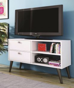 If you’re looking for a TV stand that’s both fresh and functional, look no further than this White Grey Wood Modern Classic Mid-Century Style TV Stand Entertainment Center. With splayed legs and square drawer pulls reminiscent of Scandinavian design, this TV stand offers ample storage with its two drawers and two open-back shelves. Crafted of high-quality medium density particleboard in your choice of two-tone finish.