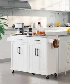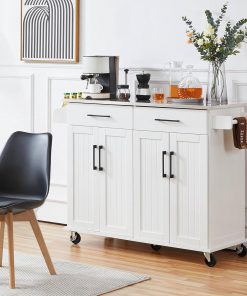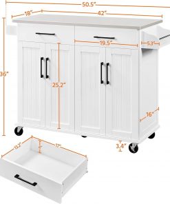 - White Kitchen Cart Island with Stainless Steel Top 2 Drawers and Cabinet