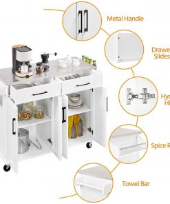 This White Kitchen Cart Island with Stainless Steel Top 2 Drawers and Cabinet is composed of two utility drawers, a spice rack, a towel bar, and pair of large cabinets with 2 height adjustable shelves. The drawers are perfect for storing culinary tools, while two cabinets offer plenty of space for small appliances, pots and pans and help you sort them more properly. You can efficiently use these spaces to store and organize. Our kitchen trolley stands on five universal wheels (2 with brakes), one of which is in the middle of the bottom to enhance the overall stability when moving. It sports super convenient and effortless maneuverability and can lock into place if needed. Made of sturdy MDF with a stainless steel cover, the tabletop is stain and water-resistant. The practical countertop can also be used as a chopping board that assists you cut meat, vegetables and fruits perfectly. Its also hassle-free cleaning with a wet/dry cloth. The rolling storage kitchen cart has two cabinets with a four-door design which includes two adjustable shelves that can store utensils, pots, pans, and other small appliances. The shelves can be adjusted to different heights of 25cm/10, 31.4cm/12.4 and 37.7cm/15 to accommodate your storage needs and help keep your kitchen essentials handy. Design and functionality meet in harmony with this mobile kitchen island. It will not only solve your problem of kitchen organizing but also add a touch of elegance to your home. The neutral color and classic design highlight the nordic style and bring your home a sense of modernity.
