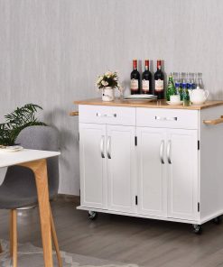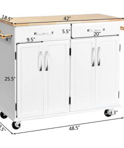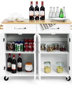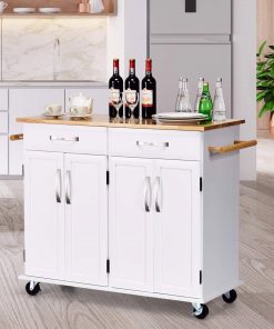This White Kitchen Cart Island with Wood Top 2 Drawers and Bottom Storage Cabinet is an ideal choice for your kitchen or dining room. The frame is made of premium PB and MDF, so this kitchen trolley is sturdy and durable enough for long time use. Features two drawers and two cabinets which provide ample storage space for you to organize your items. The rubber wood top also provides extra counter space for the kitchen to prepare delicious food. Two convenient handles make it more comfortable for push or you can use it as towel racks. Equipped with 4 rolling casters for easy movement, and 2 of them are lockable to ensure the stability while using the kitchen cart. Don’t hesitate to buy one!