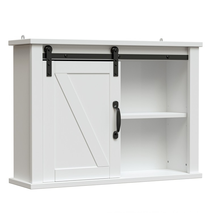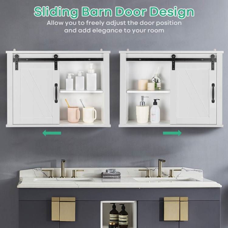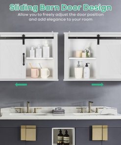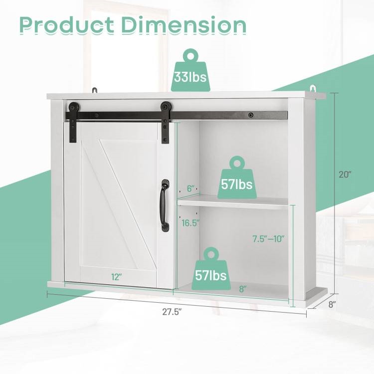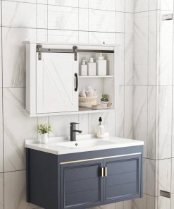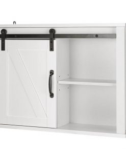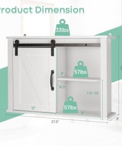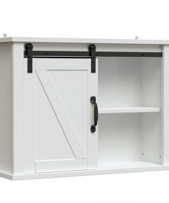 A perfect bathroom organizer! This White Modern Farmhome Sliding Barn Door Wall Mounted Bathroom Medicine Cabinet has a sleek design with retro door handle to create a stylish look, which perfectly fits into any home decor. This product is suitable for bathroom, kitchen, living room and more. Featuring 3-position shelves with height adjustable within 1.2″, this wall cabinet offers ample storage space. Reliable and durable construction will continuously bring high performance in daily use. Has waterproof design, this cabinet is built to last. Overall Dimension: 27.5″L x 8″W x 20″H. This bathroom storage cabinet is built with a simple wall mounting design. Its compact size allows you to mount it above a small vanity or in narrow places and saves plenty of space. A specific manual is included for your convenience.