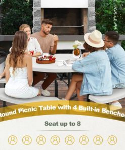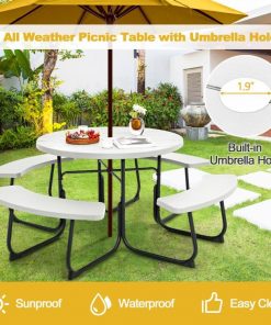 The 43″ round table White All Weather 8 Seater Picnic Table Umbrella Hole can comfortably seat up to 8 adults. Whether you’re hosting a barbecue or enjoying an outdoor meal, the picnic table provides the perfect gathering place for your family and friends. The selected HDPE material exhibits excellent resistance to cracking and fading, ensuring its durability and making it a dependable choice for long-lasting outdoor use. The picnic table bench set is supported by a powder-coated metal frame and has excellent rust resistance and stability. The u-shaped legs and reinforced x-structure provide reliable support. Besides, there exist non-slip protectors to avoid scratching to the floor. Featuring a 1.9″ hole, the round picnic table set allows you to install a patio umbrella. Hence, you can create a shaded area to enjoy a delightful meal without harsh sunshine. With the wood-like appearance and enhanced durability, the outdoor picnic table blends seamlessly with any outdoor setting, such as your yard, lawn, poolside, or garden.