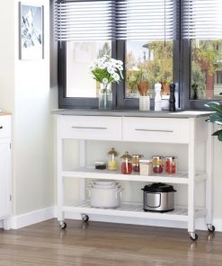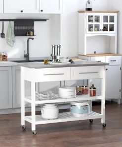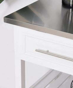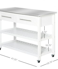 This White Rolling Kitchen Island 2 Drawers Storage with Stainless Steel Top is compact and ideal for small spaces needing a bit more storage. Features a stainless steel tabletop and 2 shelve. 4 smooth rolling wheels with 2 lockable brakes to keep the cart steady when using. Open storage design allows for quick and easy access to cooking tools and utensils.