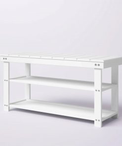 If you find yourself stepping on your shoes as opposed to into them, it might be time for a storage solution. This White Slatted Wood 2-Shelf Shoe Rack Storage Bench For Entryway or Closet does it in fine style, offering the clean-lined silhouette associated with modern aesthetics and sporting a planked top for a touch of easygoing, breezy flair. Crafted from a mix of solid and manufactured wood, this design features two shelves down below for stashing your feet’ faves and more, while the bench itself offers a space for guests to take a seat.
