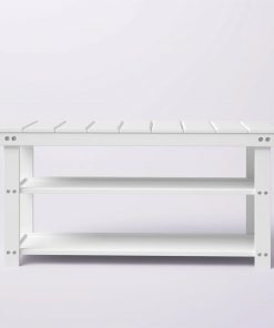 • White Slatted Wood 2-Shelf Shoe Rack Storage Bench For Entryway or Closet