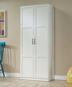 Looking to add some storage in your life? look no further. This White Wardrobe Storage Cabinet with 4 Shelves and Panel Doors offers you ample amount of storage with its four adjustable shelves and full-width upper shelf. Stash clothes, blankets, pantry items and more. Finished in a sleek white and detailed with frame and panel doors and sides, this tall cabinet is perfect for the kitchen, basement, garage, or anywhere you need a storage solution. Hide it, store it, and organize it with this practical and good-looking cabinet.