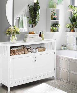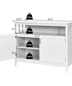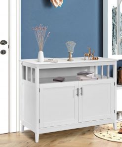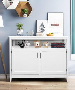 Constructed by natural pine wood and MDF board, this White Wood 2-Door Dining Buffet Sideboard Cabinet with Open Storage Shelf is solid and durable. The medium density fiberboard won’t be affected with dampness and won’t deform like normal wood after years of use. Set proper items as you like on the top surface. An open shelf can hold baskets of essentials or display items. While the large two doors can be opened and there are two layers available for convenient storage. All the boards and hardware are included. Instruction is also included for easy installation. Proper size for side ends and coffee tables in your kitchen. Create your own casual yet sophisticated storage, enjoy extra storage in your kitchen with this cabinet. We stand behind our products with our Satisfaction Guarantee. We not only offer qualified products with favorable prices to our customers but also great customer service.