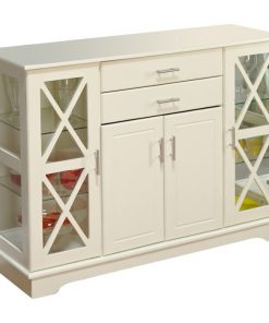 Create more space in your dining room or living room with this White Wood Buffet Sideboard Cabinet with Glass Display Doors that will match with any decor. This buffet offers both glass and solid doors a classic style. The X style door features two adjustable tempered glass shelves on each side. Constructed of MDF and tempered glass.