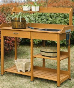 This Wooden Potting Bench Garden Work Table with Sink and Shelving in Light Oak Finish a spacious work top surface for any garden task. It provides a durable sink to make potting plants easy and to help keep workspace tidy. Featuring a large drawer that provides enough space for all of your small gardening tools and open shelves that give you more room for storage. Pre-attached side hooks included for easy reach tools.