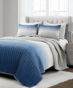 Full/Queen Navy Blue Grey Lightweight Wrinkle Fabric 3 Piece Quilt Set